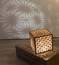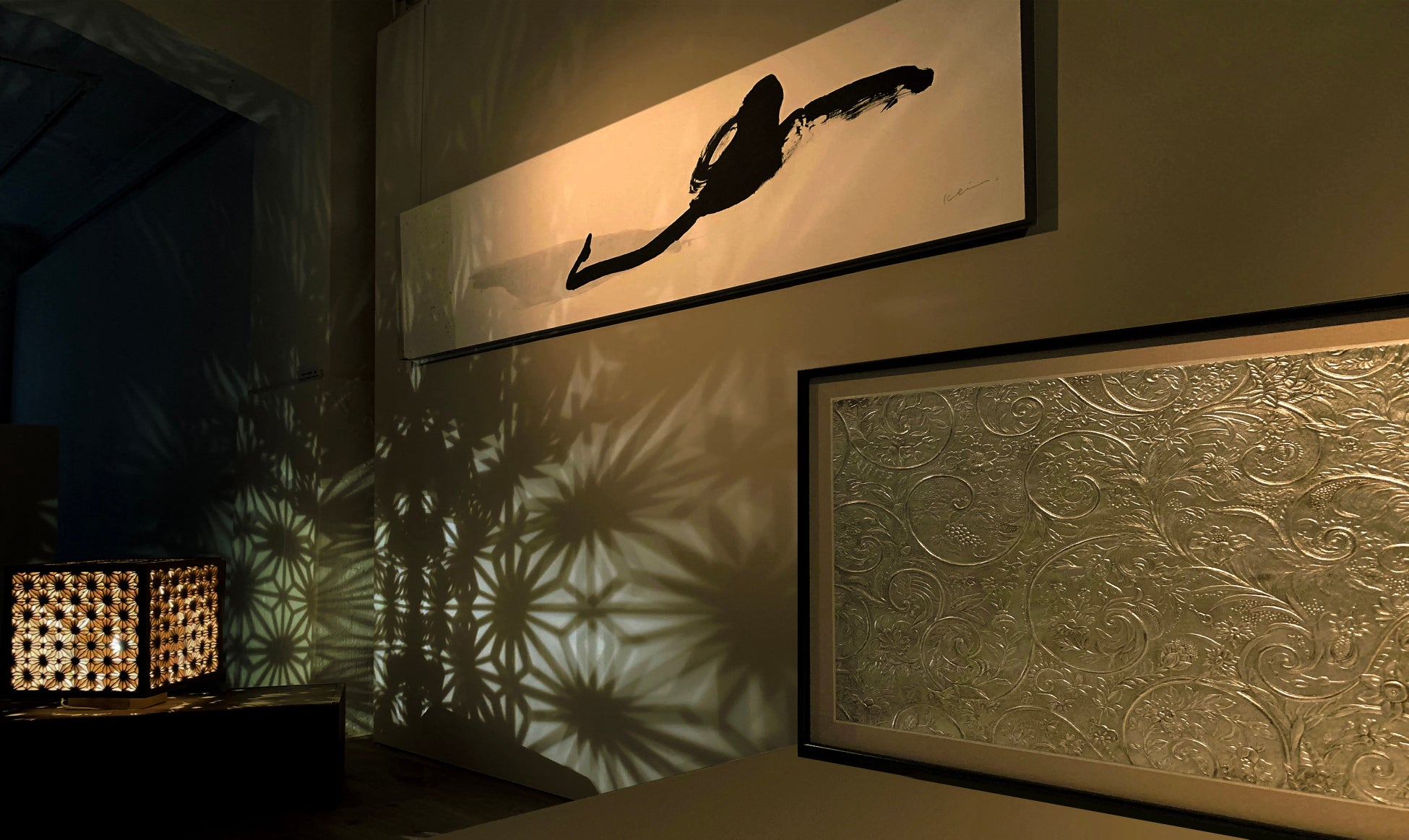 会場には、ひとつひとつ細かく丁寧に削った木の部材を組み合わせた日本の伝統的技術である組子細工の行燈が灯されます。そのやわらかな光は、繊細な模様と優美な色彩を放つ金唐紙、美しい余白と奥深い書線からなる情景豊かなキャレモジの書を照らします。それらのすべてが陰翳の中に調和した趣を味わうとき、日本人の美意識が呼び起こされるかもしれません。