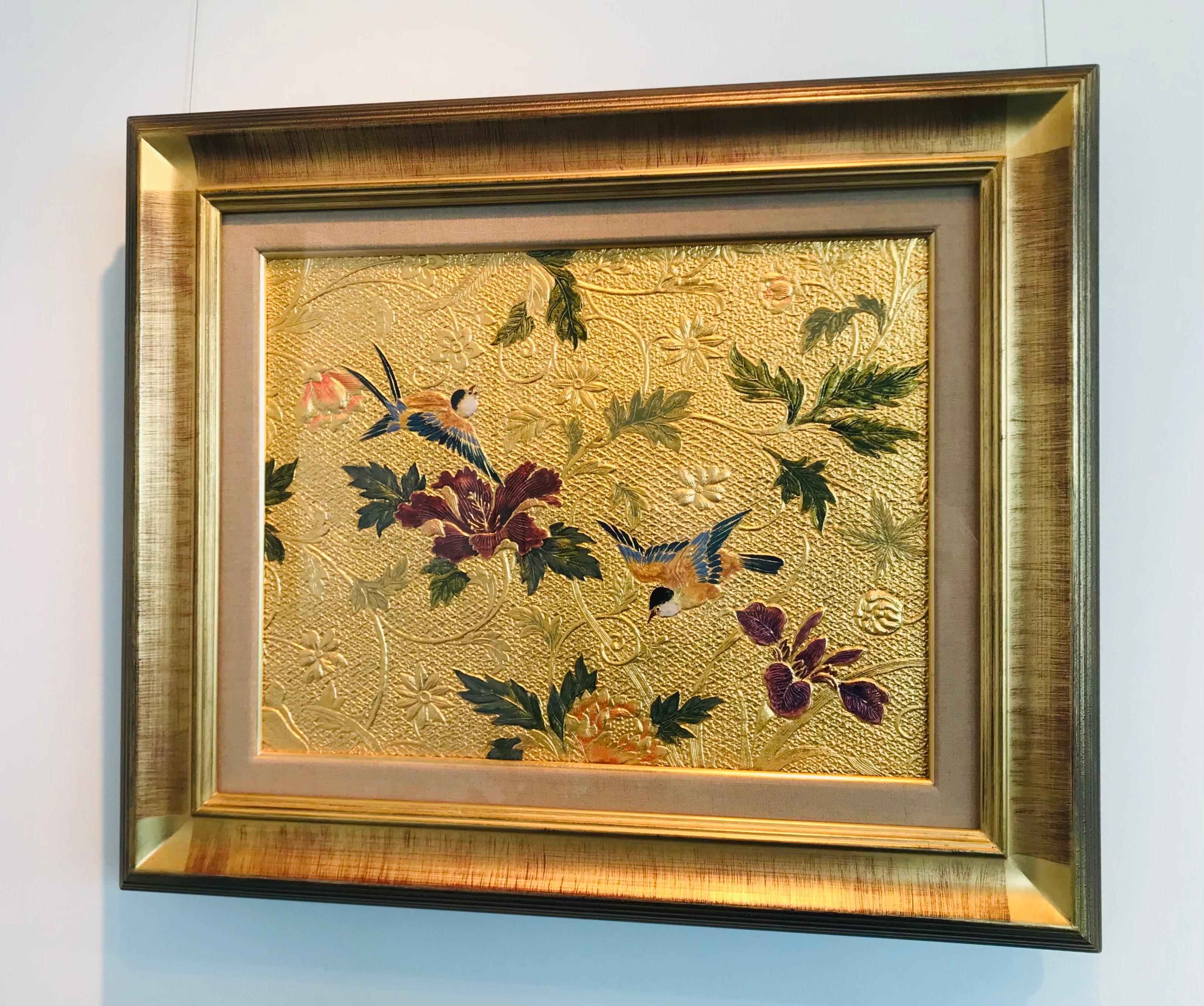 金唐紙とは、金属箔を貼った手すき和紙に文様を彫った版木棒を重ね凹凸をつけ彩色した、革に見える豪華な壁紙です。箔の上に塗る塗料次第で、金色にも落ち着いた色合いにもなります。ルーツは中世ヨーロッパで壁の内装や皮革工芸品などに用いられたギルトレザー(金唐革)で、それが江戸時代に日本にもたらされ、後に和紙を革に似せて加工する擬革紙という技術が発達しました。明治期の日本では大蔵省印刷局を中心に盛んに製造され、パリやウィーンでの万国博覧会などで高い評価を得て大量に輸出され、ヨーロッパ王朝貴族の城や宮殿(バッキンガム宮殿等)の壁をきらびやかに飾りました。日本でも国会議事堂や鹿鳴館、旧日本郵船小樽支店、旧呉鎮守府司令長官官舎、旧岩崎邸など数多くの建物に金唐紙が使われていました。その後、一度は途絶えてしまったこの技術を、金唐紙研究所代表・上田尚氏が蘇らせ、日本各地で使われていた金唐紙を復元してきました。