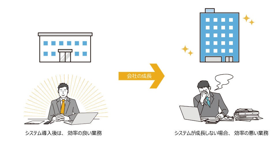 会社は日々成長し、業務も日々変化していきます。システムに業務フローを合わせていないでしょうか。作って終わりのシステムだと、足りない点や今の会社に合っていないシステムになってしまい、業務効率が下がります。