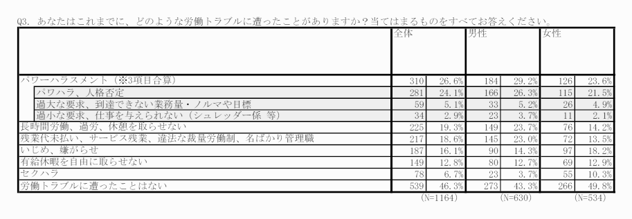 Q3は就業経験がある人のうち、労働トラブルに遭った経験があるかを問うものだ。実に過半数の53.7%もの人が労働トラブルの経験があると回答した。