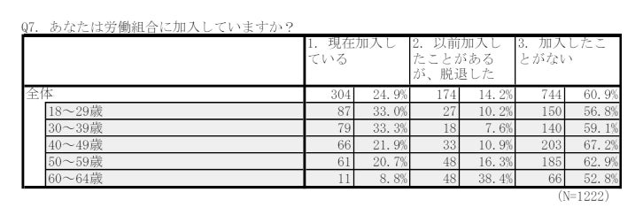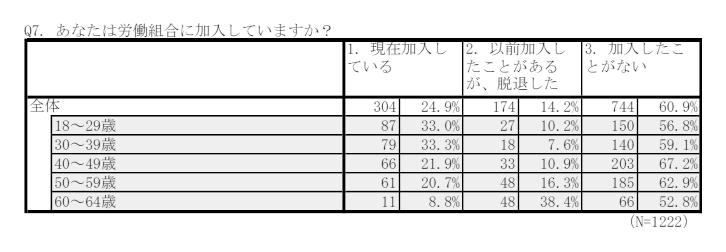 Q7は労働組合に加入してるかを聞いた。「現在加入している」は24.9%、「以前加入していた」は14.2%、「加入したことがない」は60.9%であった。