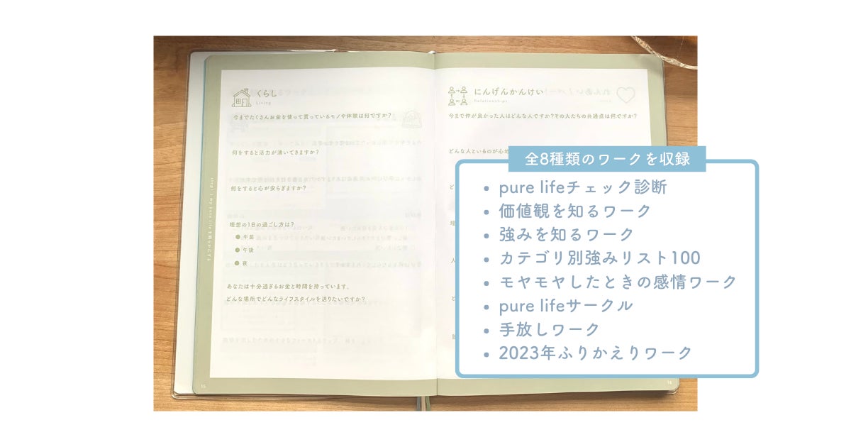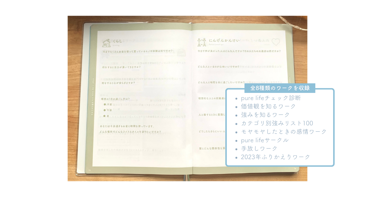 2022年版はSNSで話題を呼び、1000部がたちまち完売したpure life diary。2年目の2023年版は、ユーザーさんのご意見も参考にさせていただき、 2022年版から”40カ所以上”ブラッシュアップしました。「カテゴリ別強みリスト100」「 モヤモヤしたときの感情ワーク」など新たに追加されたワークも必見です。