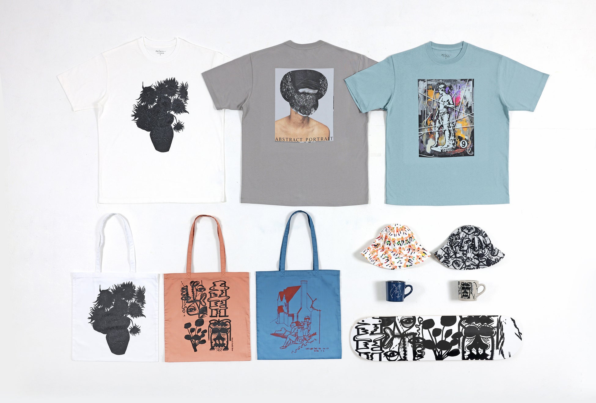 Tシャツ (10型、サイズ:S〜XL展開、価格:税込4,950〜6,600円)、トートバッグ(4型、価格:税込4,400円)、リバーシブルハット( 2型、価格:税込8,250円)、マグ(2型、価格:税込3,080円)、スケートデッキ(3型、価格:税込27,500円)、ポスター(2型、価格:税込3,850円)。その他、本展用にヒロ杉山が制作した100部限定ネオシルク版画やZINEも販売。