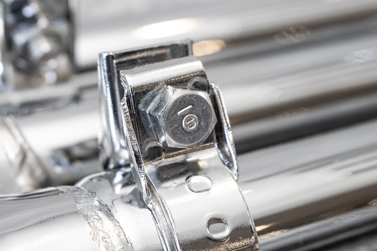 サイレンサーのバンド部分などに使われているボルトは、頭に独自の刻印が入ったホンダの純正ボルトを使用。細部に至るまで忠実に純正クオリティを追求しています。