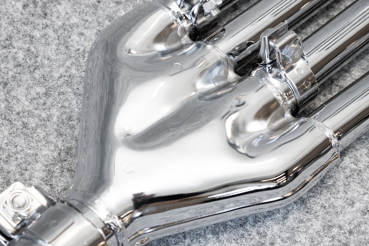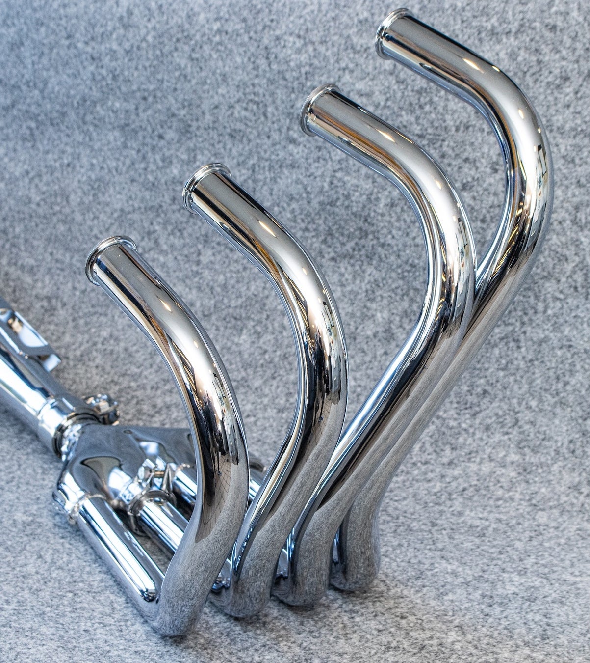 マフラーの中でも最も高温になるのがエンジンに最も近いエキゾーストパイプの最初の曲がりの部分です。この部分のメッキに焼け色が付かないように、純正はエキゾーストバイプの約半分ほどが二重管となっていました。