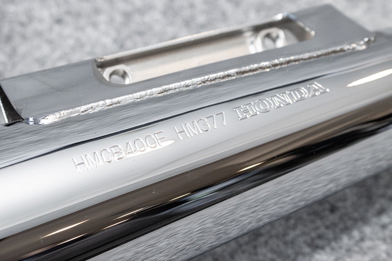 マフラーのクロームメッキは自社で行われ、厚みや品質も当時のホンダ純正と同等。厚いメッキや中古マフラーの再メッキ品では刻印の角が甘くなり、文字がしゃきっと見えないケースも多々ありますが、マフラーの刻印も実にはっきりとしています。
