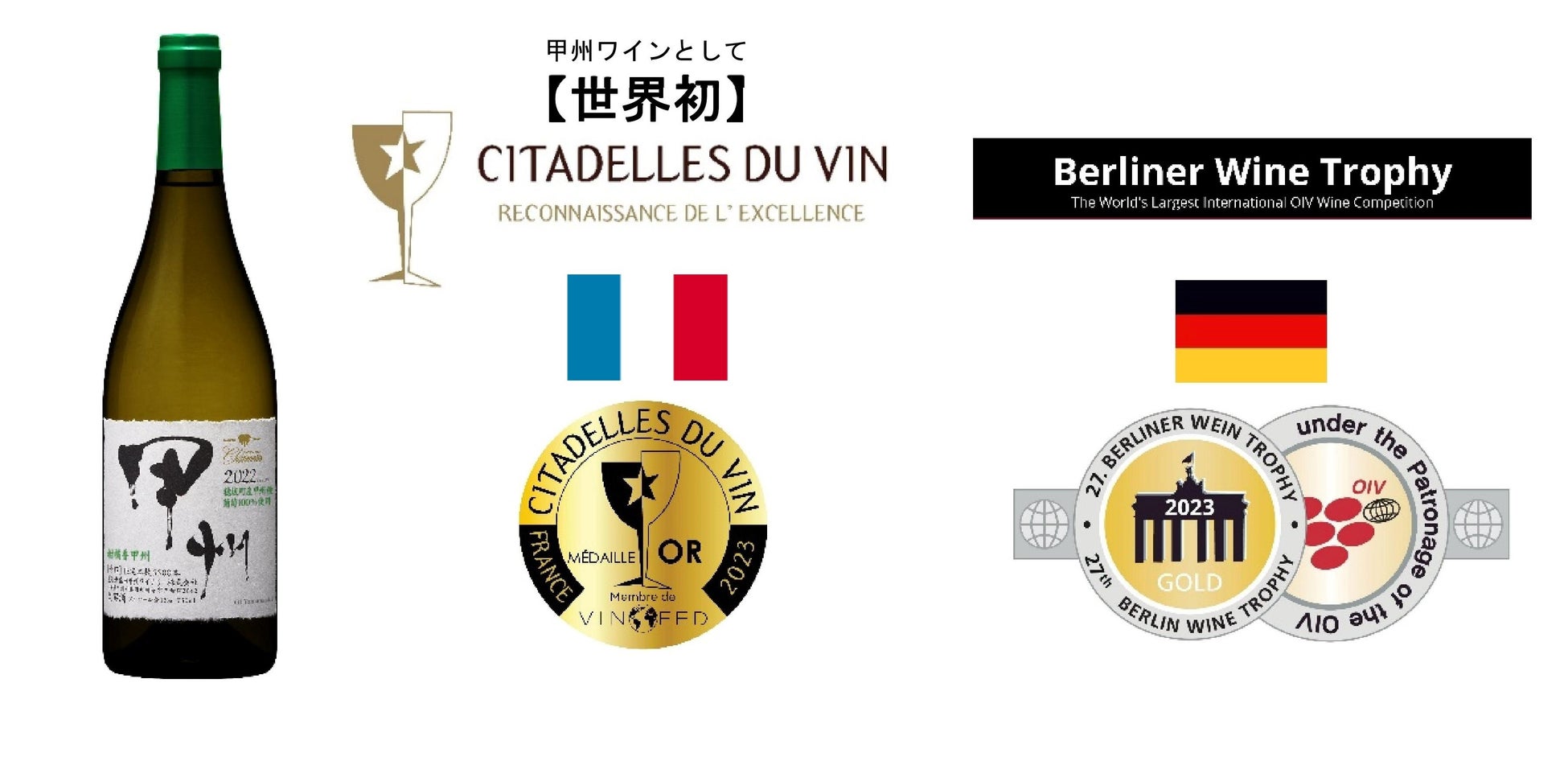 フランス・ボルドーの国際ワインコンクール「シタデル・デュ・ヴァン 2023」及びドイツ・ベルリンの国際ワインコンクール「ベルリナー・ワイン・トロフィー」において、「シャンモリ 柑橘香穂坂甲州2022」が金賞を受賞。