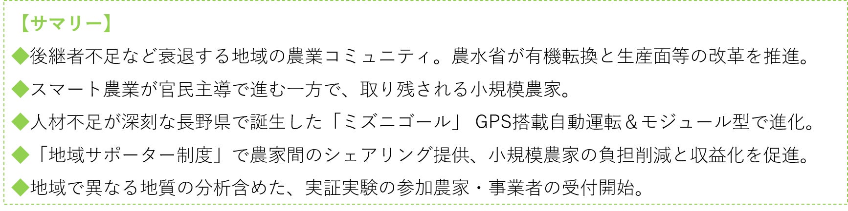 - 農家間のロボットのシェアリングで、小規模農家のコスト負担を解消