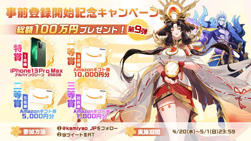 Sky Entertainment Network Limitedが配信予定の日本神話を題材にしたスマートフォン向け新作アプリ『神界奇伝 ~八百万神の幻想譚~』(以下、『神界奇伝』)が、本日(4月20日)より事前登録を開始し、それに伴い、事前登録者数に応じてゲーム内豪華アイテムが配布される「事前登録開始記念キャンペーン」も同時開催中です。更に、『神界奇伝』公式Twitterでは、事前登録開始の祝に、「総額100万円Twitterプレゼントキャンペーン」の第9弾を開催し、iPhone 13 pro max アルパイングリーンや10,000円分のAmazonギフト券が当たるフォロー&RTキャンペーンも開催中です。興味がある方は是非フォローして最新のキャンペーン情報をチェックしてみてください!