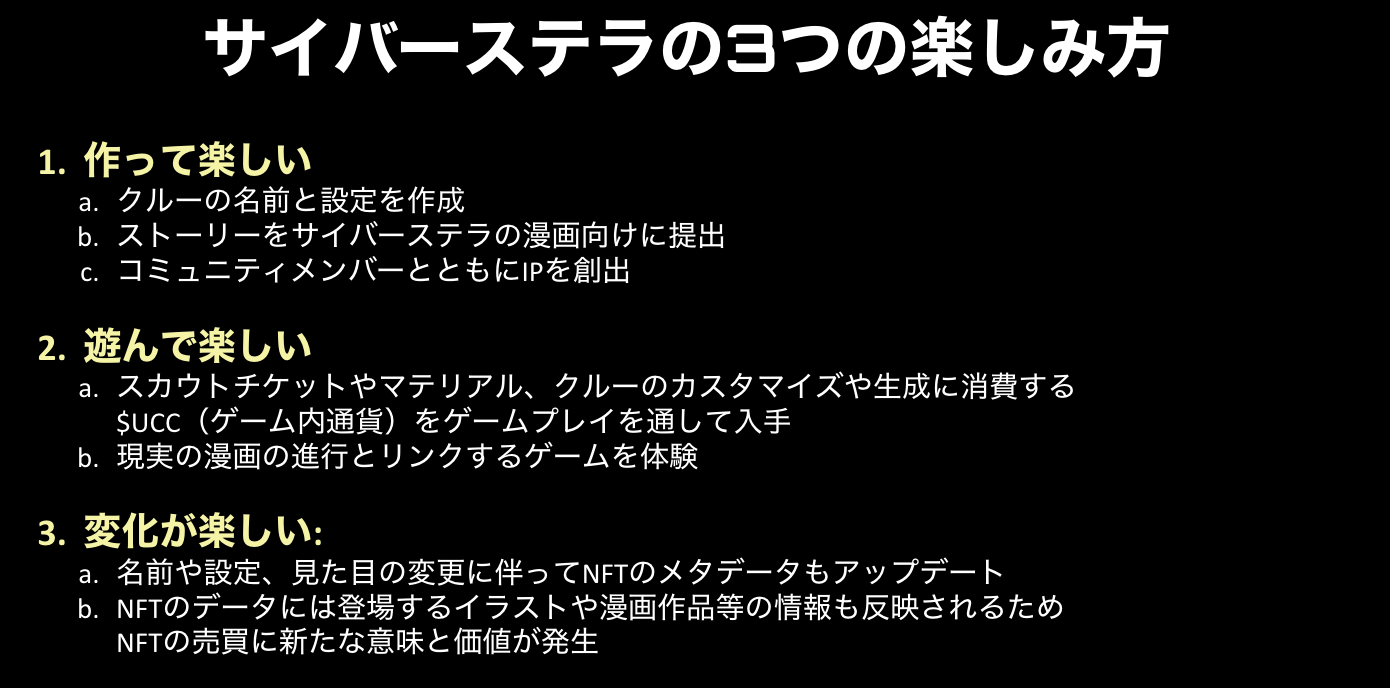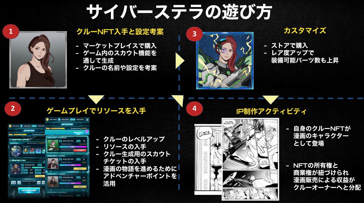 Cyberstellaはコミュニティが中心となって共同で漫画などの作品を制作するIP創造プラットフォームです。世界各国からコミュニティメンバーが集まり交流しています。Crewと呼ばれるアバターを中心に、命名したり設定を考えたりしながらCyberstellaのナラティブを考え、実際に自分で名前や設定を考えたCrewがプロの漫画家によって作品化されたり、イラスト作品となるプロセスを楽しみます。