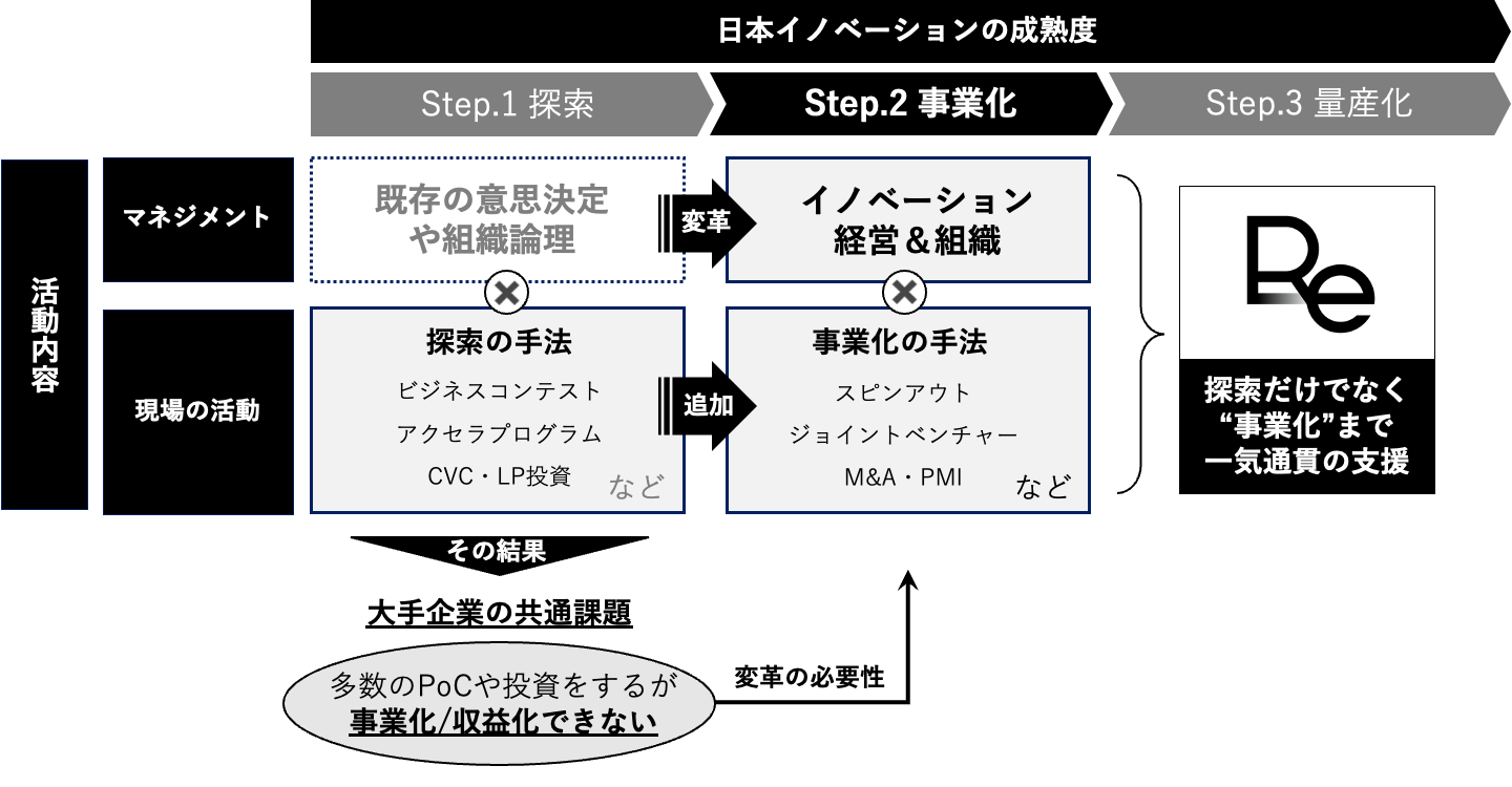 現在、多くの大企業や自治体がイノベーション活動を活発化させていますが、その活動の大半は、アイデア検討やPoC、また、ベンチャーへのマイナー出資等にとどまっており、事業化・収益化に至る事業はほとんど生まれていません。