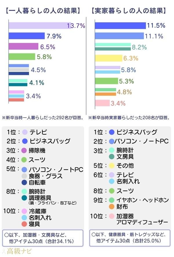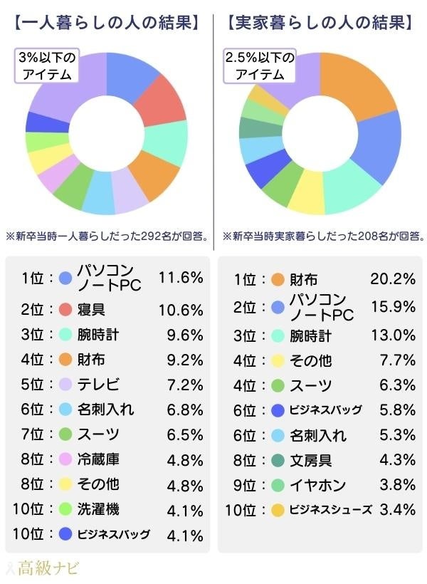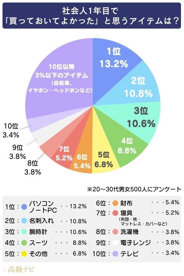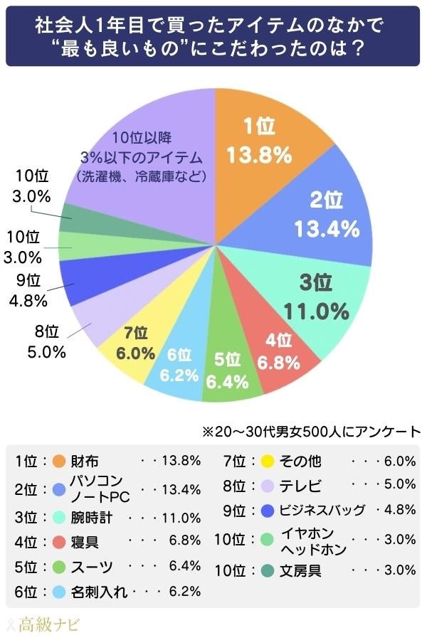 株式会社secret place(東京都世田谷区、代表取締役社長:竹内湧也)は、世界中から厳選した高級な品々を紹介するメディア「高級ナビ」にて、20〜30代の社会人男女、合計500名を対象に、【社会人1年目の購入品】についてインターネット調査を実施。「社会人1年目で買ってよかった物ランキングTOP10」や、「最も高級品にこだわったアイテム」「あのとき買って後悔した物」などの調査結果を発表しました。
