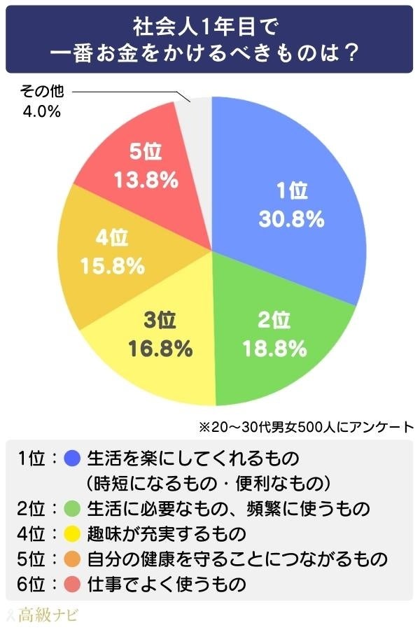 そこで「高級ナビ」編集部では、20〜30代の先輩社会人男女500人にアンケート調査を実施し、「新卒1年目で買ってよかった物」や「お金を出してでも高級品にこだわった物」や、「あのとき買わなくてもよかったと思う物」を調査しました。