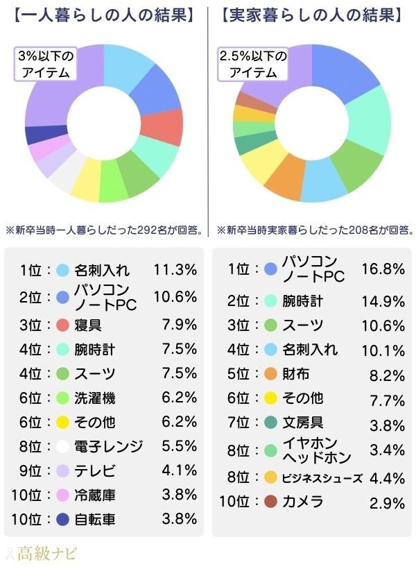 「一人暮らし」と「実家暮らし」のどちらも、パソコン・財布・腕時計・スーツ・名刺入れなど、ビジネスシーンでよく使うものや人に見られる機会が多いものが上位に分布する結果に。