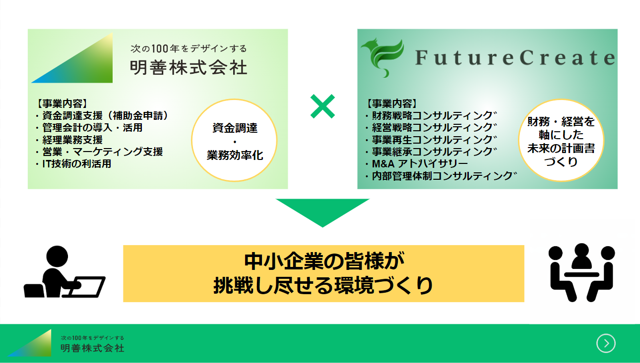 補助金申請支援やマネコン(管理会計支援)を提供する明善株式会社(本社:北海道札幌市、代表取締役:中谷太一)が、2022年7月1日(金)より税理士の垣根を超えた経営サポートサービスを提供する税理士法人Future Create(フューチャークリエイト)(本社:北海道札幌市、代表社員 税理士 島元 宏忠 / 共同代表 税理士 植島 悠介)と業務提携に至りましたので、お知らせします。