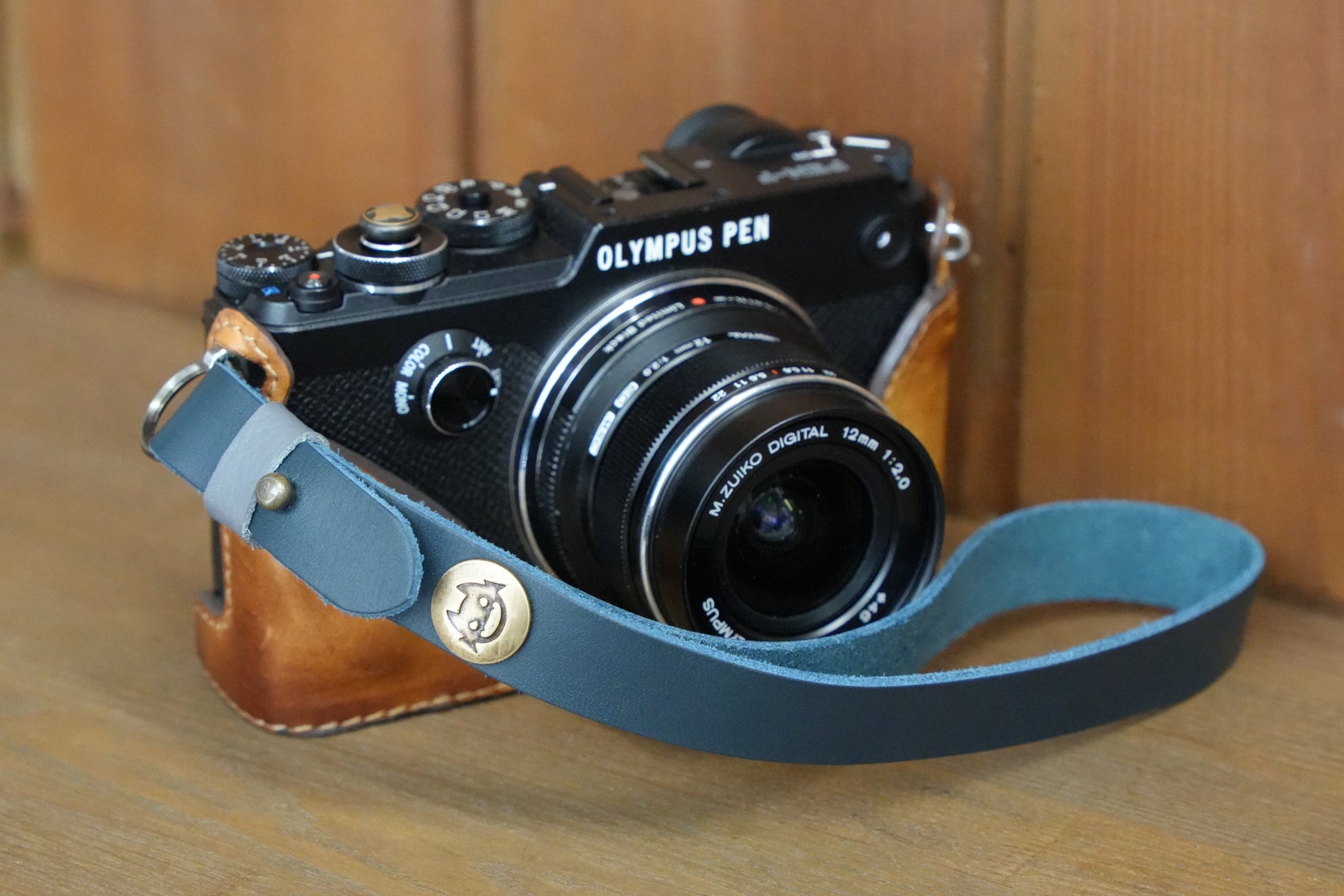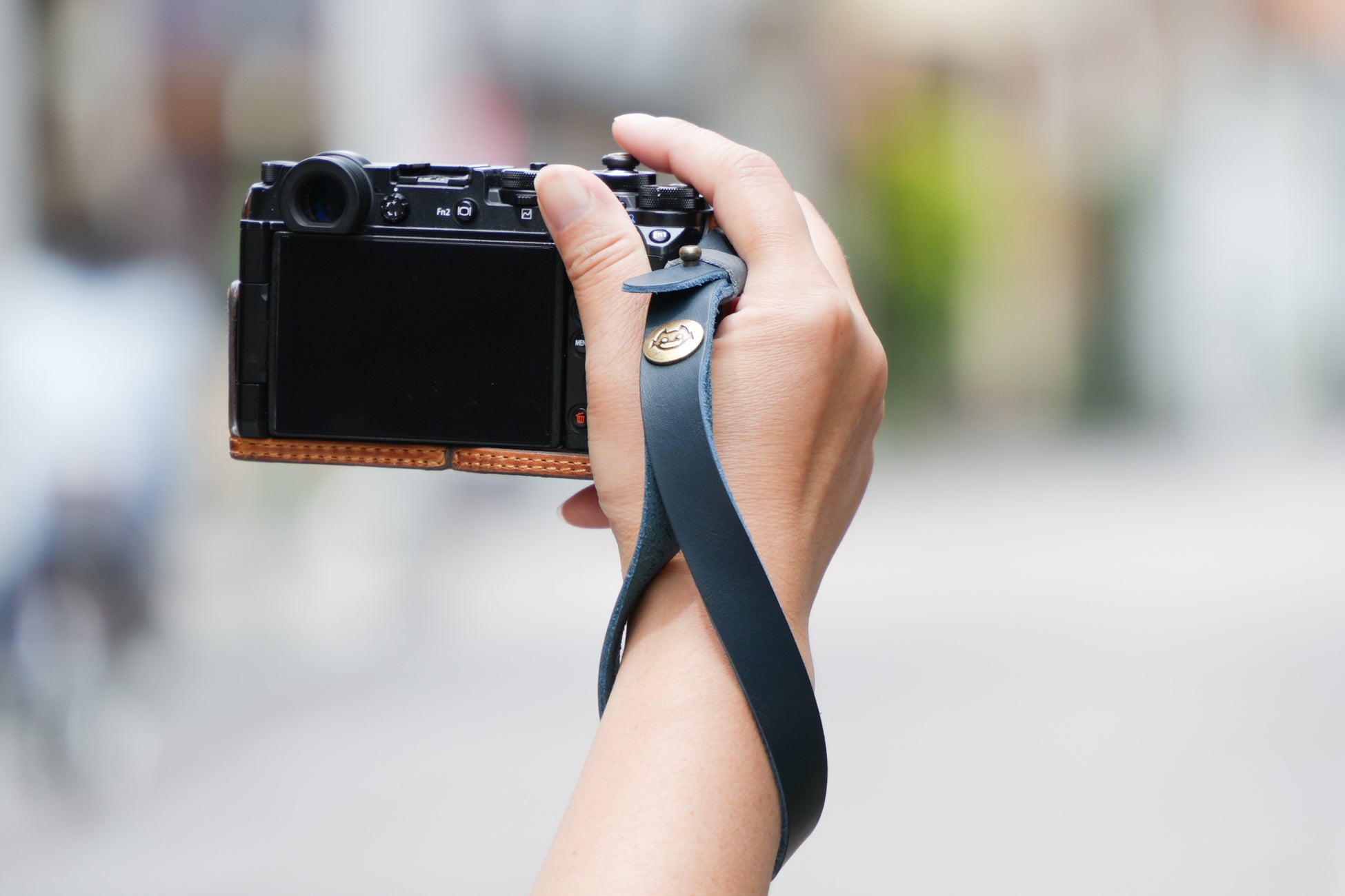 カメラの落下防止や撮影時の固定に便利な牛革製ハンドストラップ。