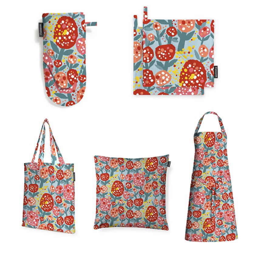 輸入販売される商品は、布団枕カバーセット、クッションカバーを始め、エプロン、キッチンミトン、トートバッグ、タオル等で、フィンランドらしい春のカラーバリエーションで展開します。