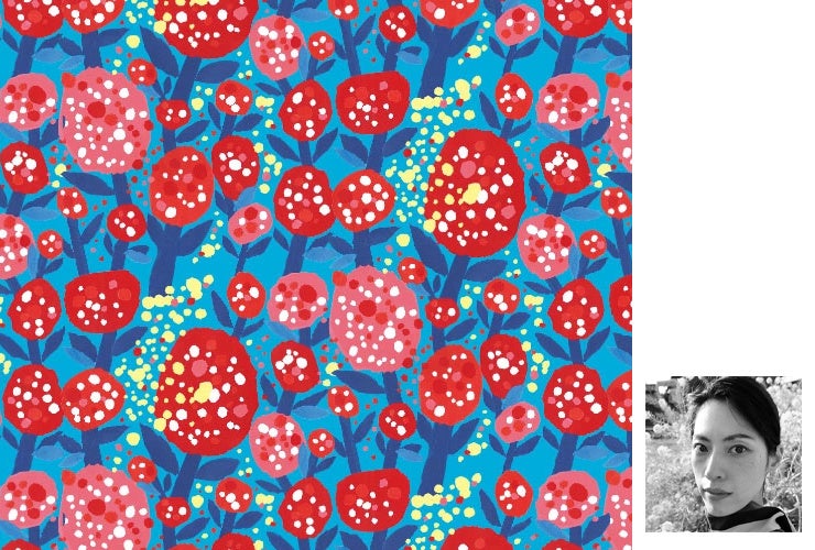 このデザインは地球温暖化によって脅かされている「四季」を表現した4デザインのうちのひとつで、日本、フィンランドどちらも誇るべき美しい四季が、近い将来なくなってしまうのではないか危惧しながら、のびやかな生命力、パッション、エネルギー、太陽の力強さを、夏の大輪の花々になぞらえて表現した作品です。受賞にあたり、「私にとって、心の中にある表現したいものを、一番忠実に再現できる手法がコラージュです。このデザインは大小様々な円をひたすら手でちぎって創り、パズルのように納得するまで何度も配置し直しました。数ミリ角度が違っても全体の印象に影響を与えるので、色と形のバランスには非常にこだわりました。花々の赤とピンクは「情熱と愛」、イエローと白の水滴は「希望と純粋さ」、葉と茎のネイビー、背景のブルーは「冒険」を意味し、私はこれらのキーワードをいつも大切にしています。美しさの中に力強さを備えた「Saku」は、きっと皆さんの励ましとなり、勇気を与え、力を貸してくれると思います。私のデザインが多くの方に愛されることを願っています。」と語ります。フィンレイソンのデザインチームは、「夏の花々の魅力あふれる、心和む幸せな雰囲気のデザインです。紙をちぎって作られたこのデザインは、心地よくナイーヴであり、子供のころの夏の思い出のようなノスタルジーを感じさせます。今回の春夏コレクションでは、掛け布団カバーやキッチン商品などで、春夏らしい暖かくフレッシュな3色で展開しています。」と語ります。