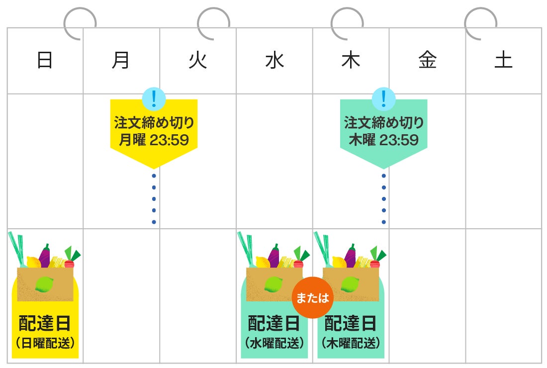 | 注文締切日 | 日曜日配達: 前週月曜日23時59分(従来通り) 水曜・木曜日配達: 前週木曜日23時59分 |