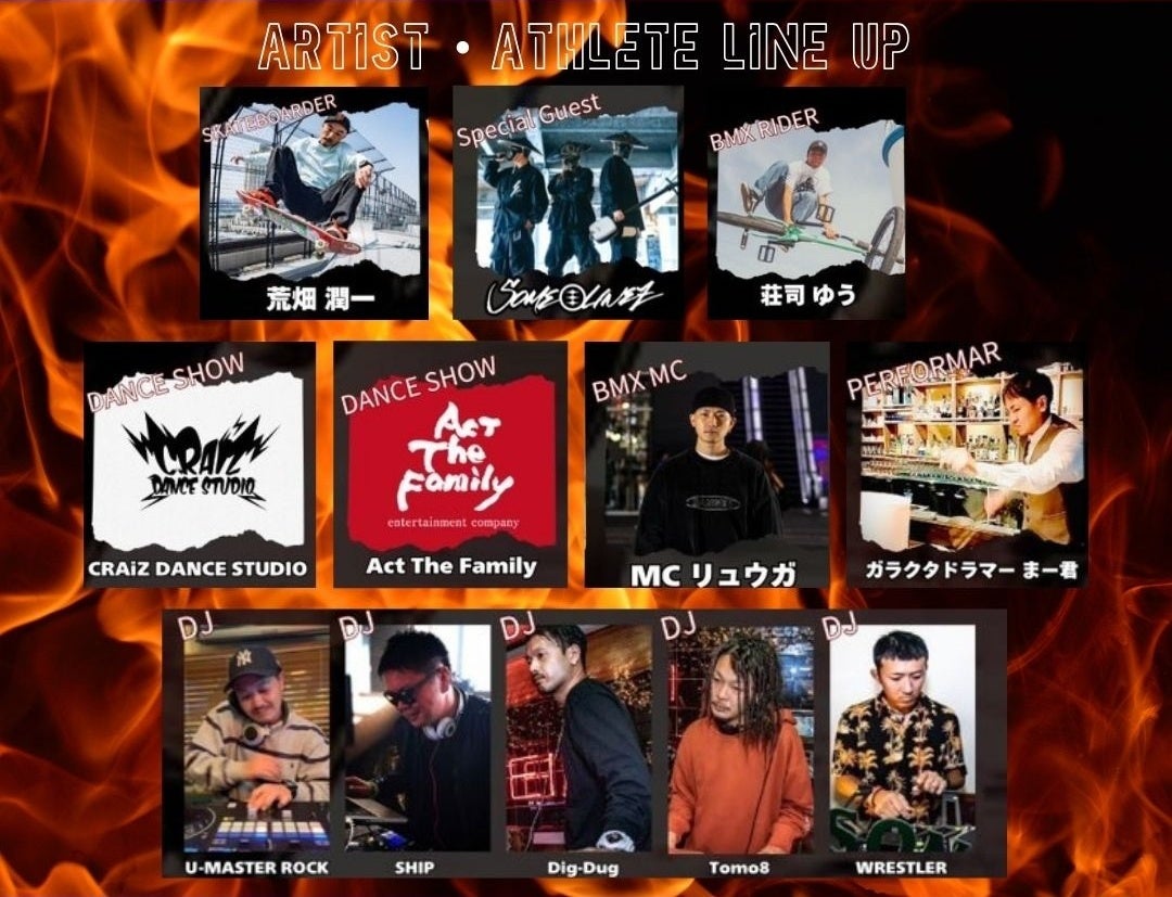 本イベントには、世界各地で注⽬を集める実⼒派アーティスト・アスリートが集結。日本の伝統楽器津軽三味線・HUMAN BEATBOX・STREET DANCEを掛け合わせた「SOME≡LINEZ」、何でも楽器にしてしまう地域出身パフォーマー「ガラクタドラマー まー君」、skateboardrider「荒畑潤一」、BMXrider「庄司ゆう」、BMX MC「MCリュウガ」、地域ダンススクール「CRAiZ dance studio」「Act The Family」も参加します。併せてクラブDJノンストップMIXも、どうぞお見逃しなく。