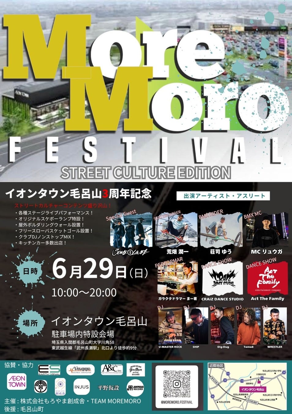 株式会社もろやま創成舎(本社:埼玉県毛呂山町、代表取締役:笠原 喜雄)とTEAMMOREMORO(毛呂山町を起点に活動、代表:松本裕太・吉田武史)は、“子ども達と地域の未来を創造したい”埼玉県毛呂山町発 アーバンスポーツ×音楽イベント「MOREMORO FESTIVAL ~street culture edition~」を、6⽉29⽇(日)『イオンタウン毛呂山』にて開催します。