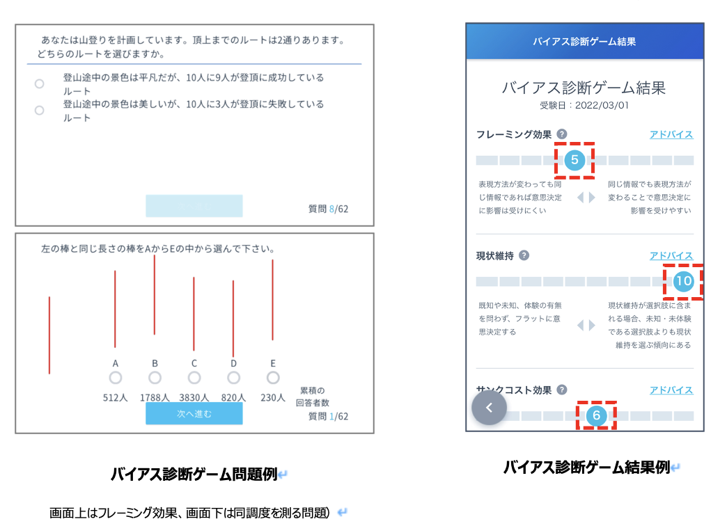 『バイアス(認知バイアス)』とは:直感や今までの経験をもとに偏ったものの見方をしたり、判断をすることを意味します。ミイダスが提供する「バイアス診断ゲーム」は、受験した人の「意思決定の時の癖」を診断できるコンテンツです。具体的には、過去投資したリソース(金、時間、労力)に影響されやすく、切り替えに時間がかかるサンクコスト効果、同じ情報でも表現が変わることで意思決定に影響を受けやすいフレーミング効果、意思決定を行う際周囲の言動から影響を受ける度合いの同調度など、22項目の認知バイアスや指向性の特徴を知ることができます。また診断後は各項目の特徴の解説や、普段の判断がバイアスの影響を受けないようにするためのアドバイスなどが分かります。