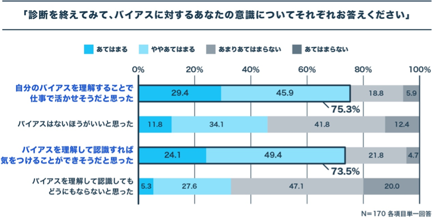 診断受検後、「自分のバイアスを理解することで仕事で活かせそうだと思った」と回答した人は75.3%(あてはまる29.4%、やや当てはまる45.9%)に上りました。また、「バイアスを理解して認識すれば気をつけることができそうだと思った」と回答した人も73.5%(あてはまる24.1% ややあてはまる49.4%)と7割を超えています