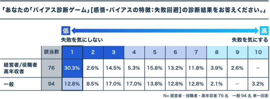 参考)ちなみに、下記グラフの通り、経営者・役職者に800万円以上の高年収者を含めても10段階の中で最も低い1の回答が30.3%となり、一般と比べ「失敗を気にしない」人に偏ることが多い傾向にあるようです。