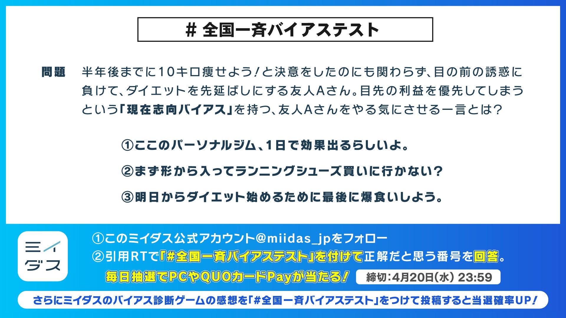 今回「バイアス診断ゲーム」の公開に伴い、「#全国一斉バイアステスト」キャンペーンを実施します。ミイダス公式Twitterアカウントをフォロー&引用RTいただき、 #全国一斉バイアステストを付けてテストに解答。公式アカウントから投稿されるテストに対し、『バイアス』を持つ人をやる気にさせる一言を選びます。正解した投稿者の中から抽選で賞品をプレゼントいたします。