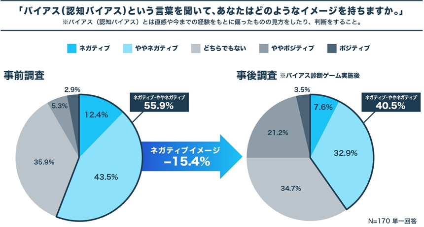 ちなみに『バイアス』にポジティブなイメージを持つ人に関しても、事前調査ではわずか8.2 %(ポジティブ2.9%、ややポジティブ5.3%)という結果に対し、事後調査では24.7%まで増加しています。(ポジティブ3.5%、ややポジティブ21.2%)