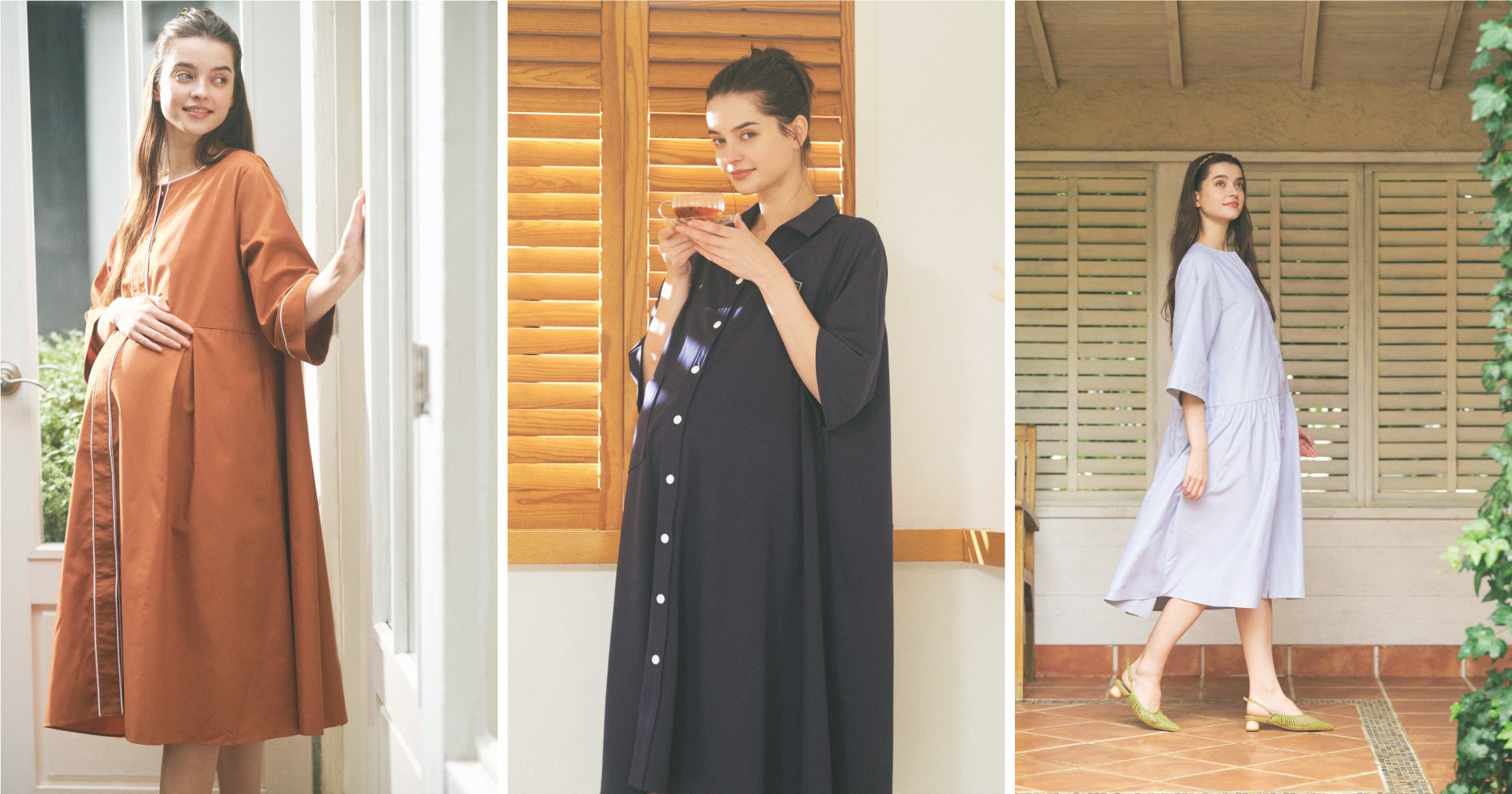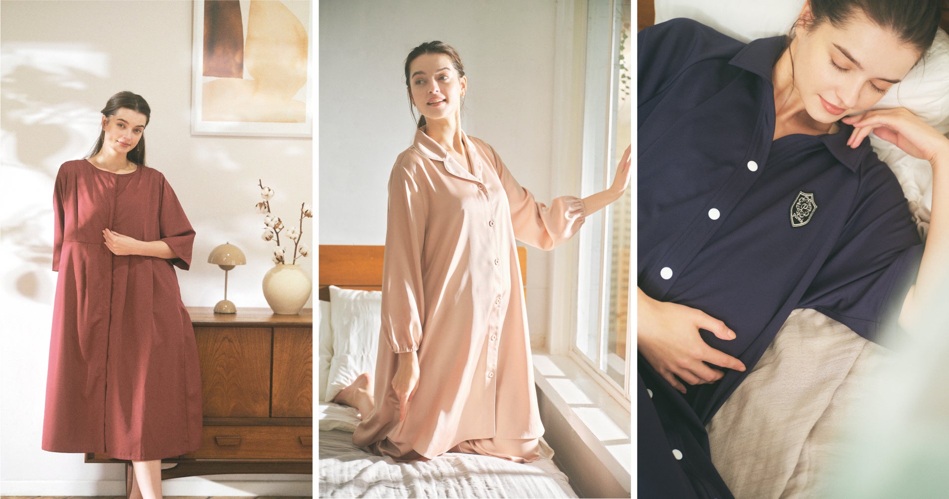 左からPB-24002タックプリーツ分娩着 テラコッタ PB-24003ポロワンピース分娩着 ネイビー PP-24002ティアードパジャマ グレー