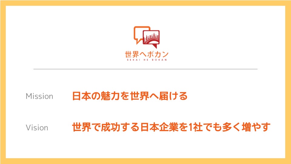 以前の当社ビジョンは「言葉とマーケティングの力で日本と世界の隔たりをなくす」であり、これは世界へボカンの哲学として現在も重要視しております。しかし今回の見直しを通し、企業ビジョンは約3年後の実現を目指す具体的な目標であるべきだと考え、その結果「世界で成功する日本企業を1社でも多く増やす」というビジョンにリニューアルいたしました。