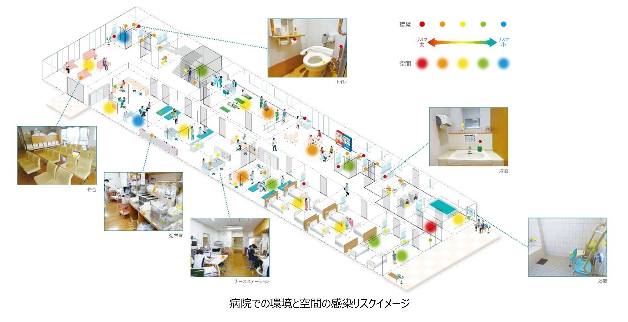 建物環境感染リスクマネジメント「りすくま」は、建物内の感染リスクを見える化し、感染対策を最適化するためのシステムです。