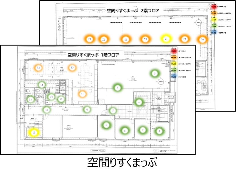 環境の状態のデータと空間の状態のデータを組み合わせ、建物内の感染リスクを見える化し、感染対策最適化のご提案をします。