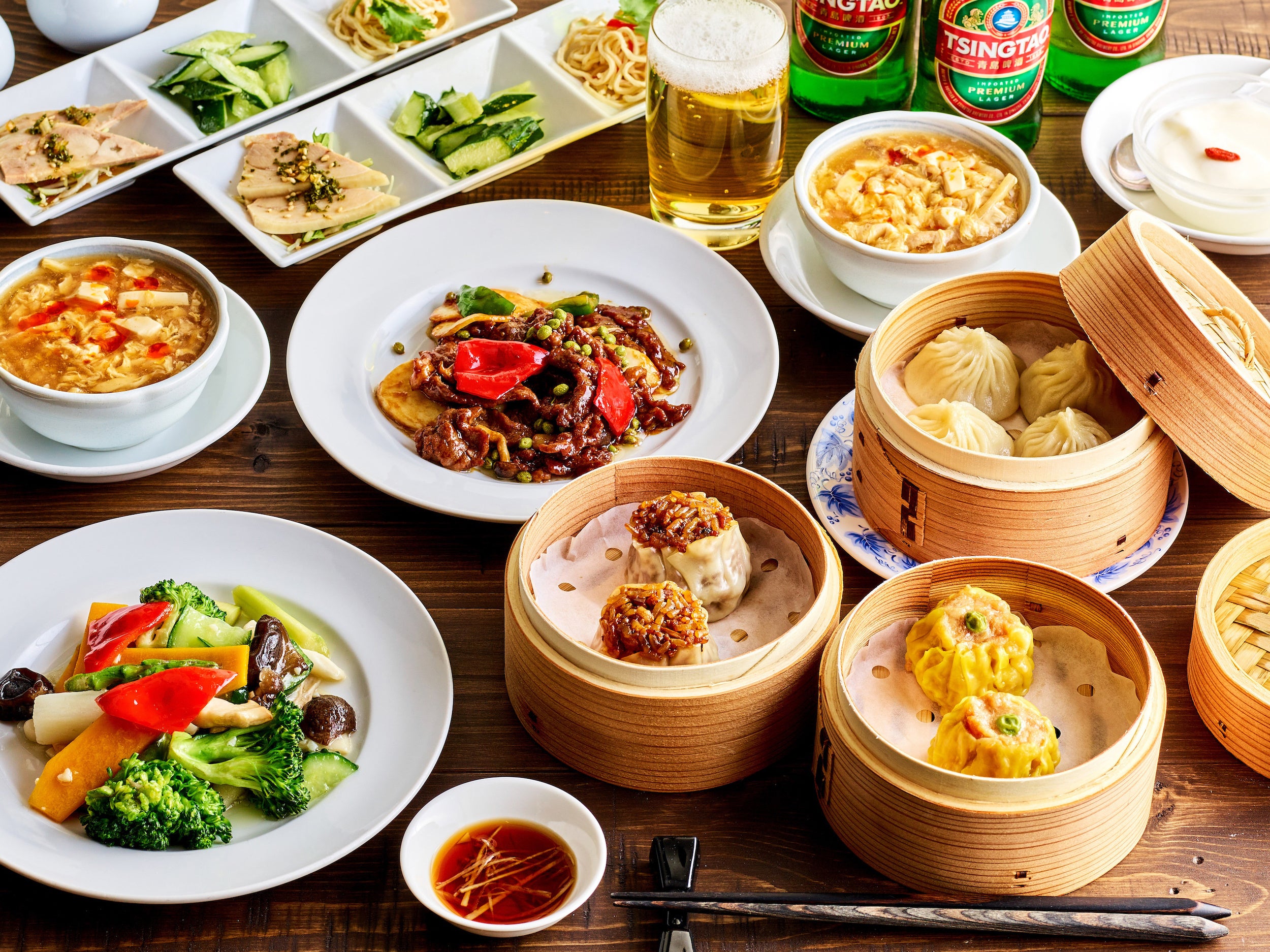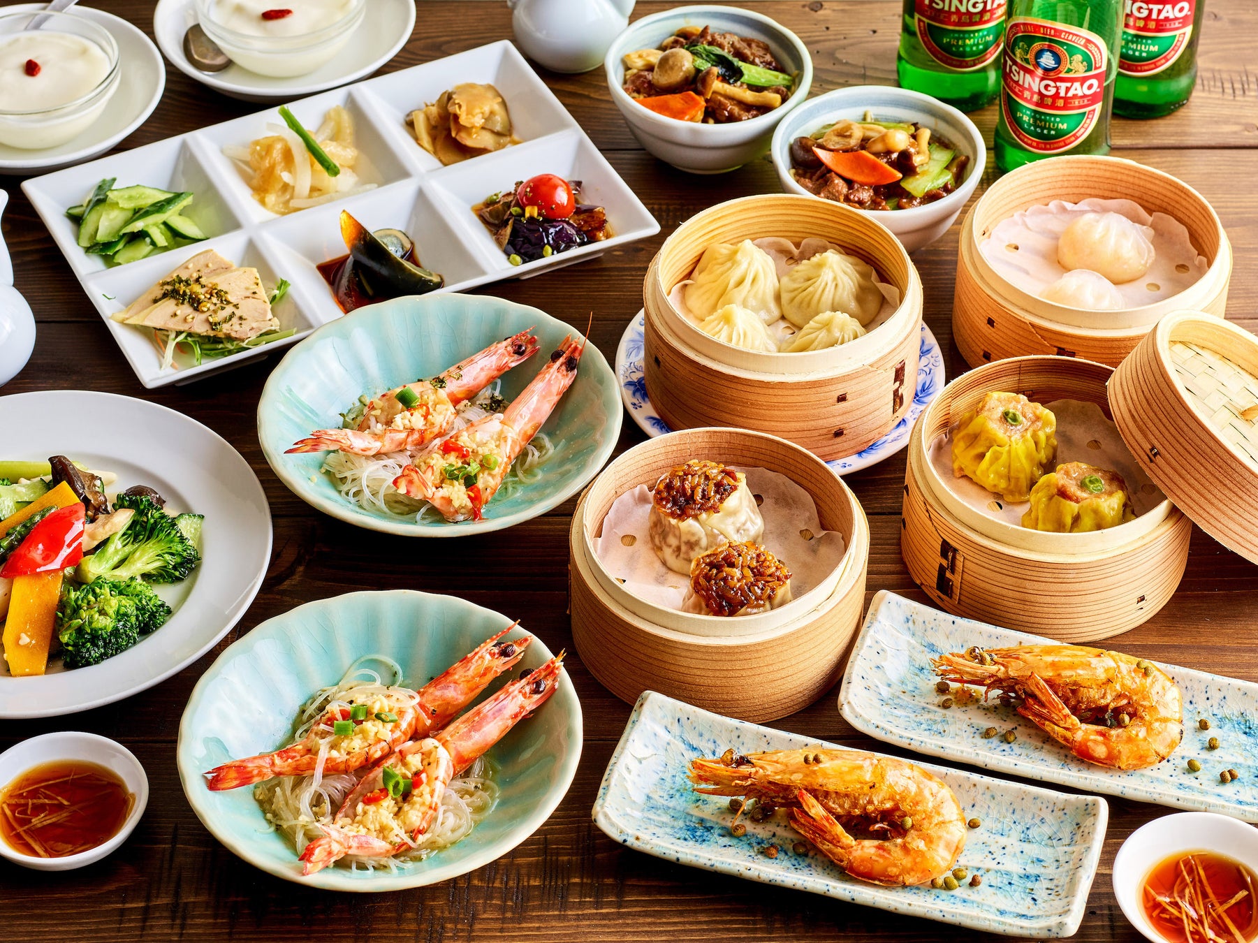 車海老のガーリックソース蒸しはエビの甘みをギュッと濃縮し、食欲をそそる一品。もう一品は山椒と共に高温でカラッと素揚げし、特製タレにくぐらせお召し上がりいただきます。看板メニューの小籠包はもちろん、人気の点心も少しずつお楽しみいただけます。