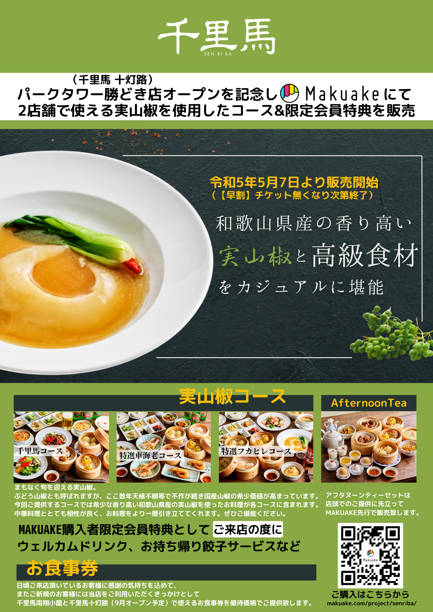 上海家庭料理「千里馬」パークタワー勝どき店オープン記念!実山椒と高級食材を使ったコース&アフタヌーンティーセットをMAKUAKEで販売。
