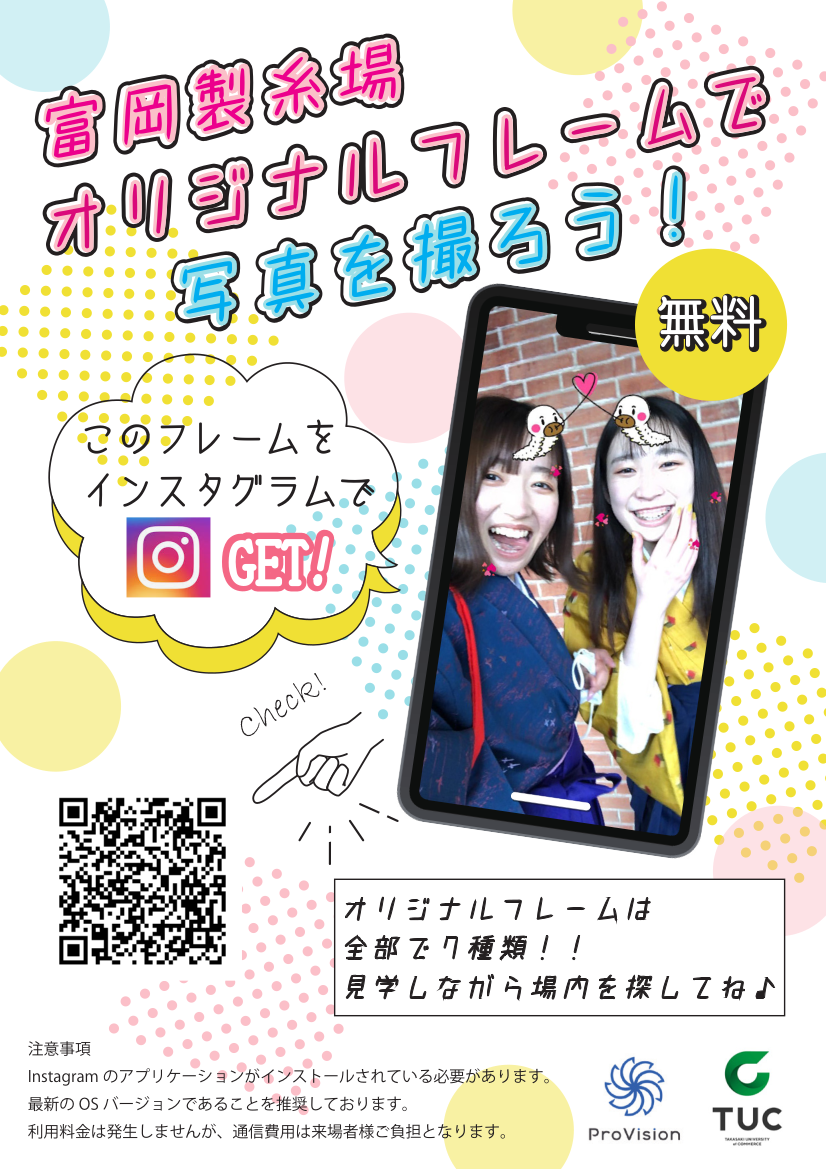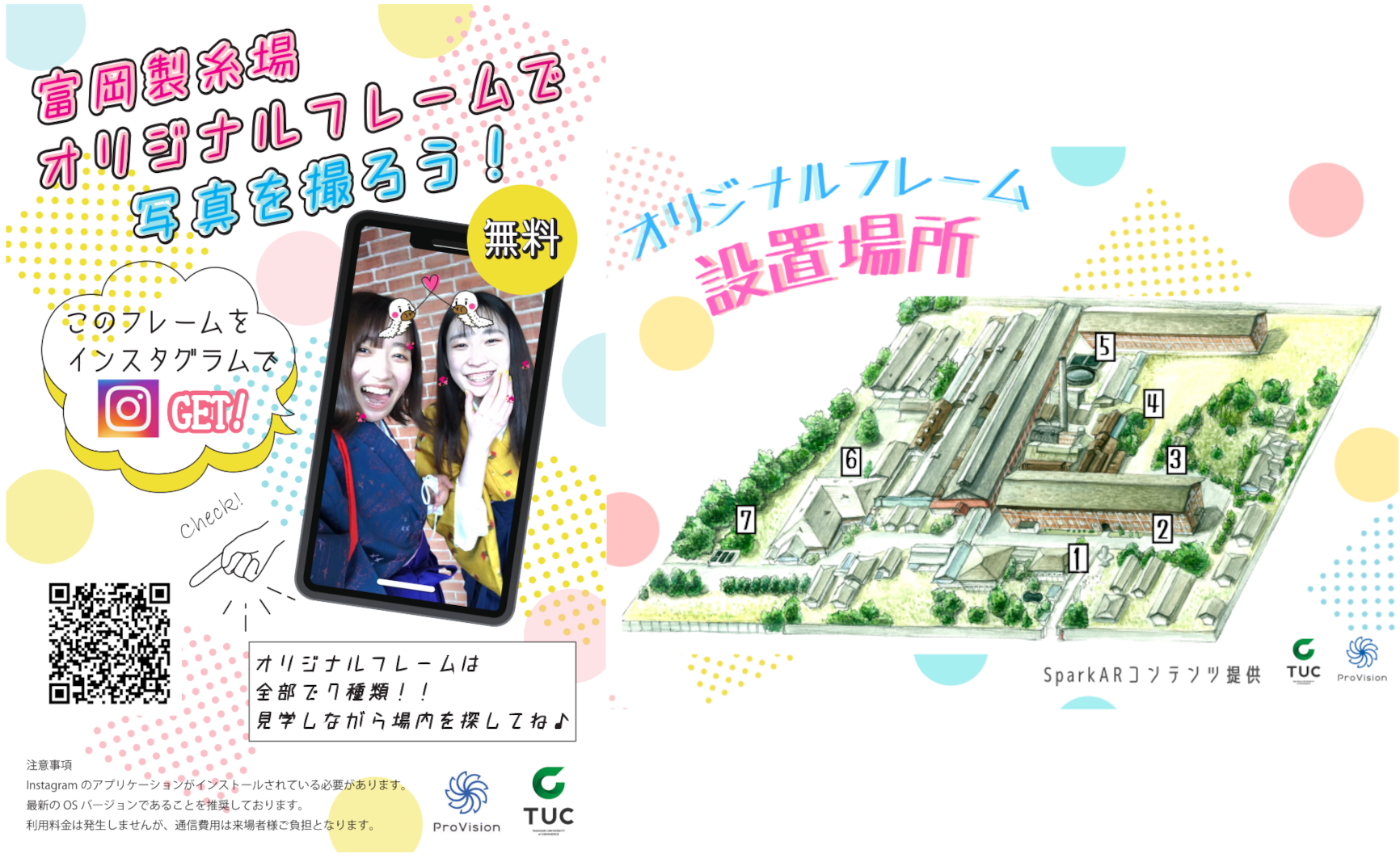 そこで、富岡製糸場と、高崎商科大学 地域連携センター「工女プロジェクト」に参加する学生、そしてProVisionが合同で、InstagramやAR技術を活用した若年層向けの企画を検討した結果、この度の富岡製糸場オリジナルARフォトフレーム提供に至りました。