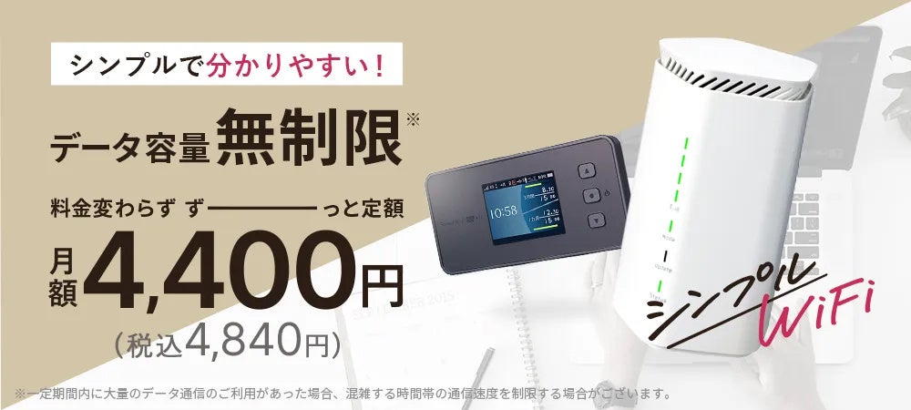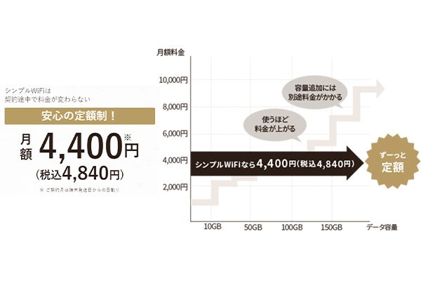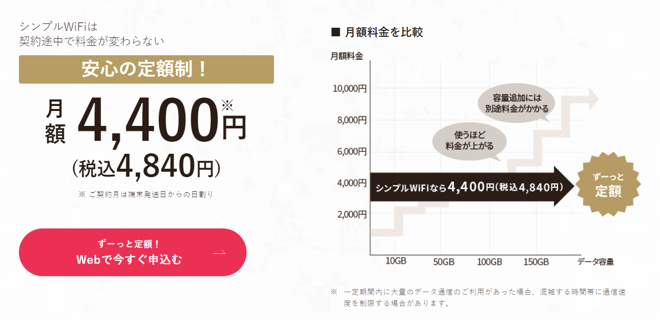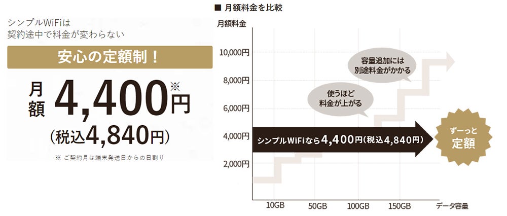 シンプルWiFiは契約途中で料金が変わらない定額制。月額4,400円※1(税込4,840円)でご利用いただけます。