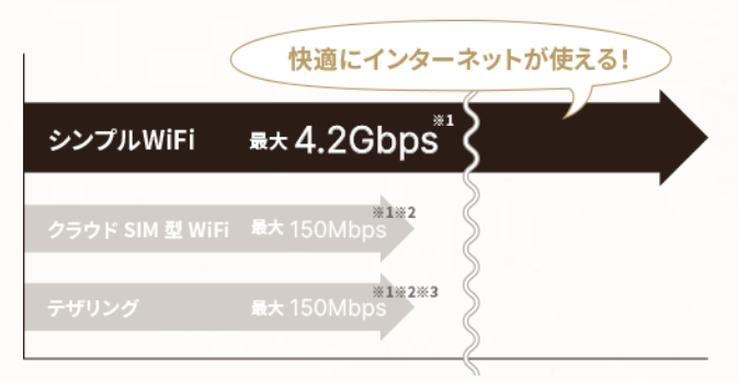 クラウドSIM型のWiFiやスマホのテザリングと違う圧倒的な通信速度が特徴です。