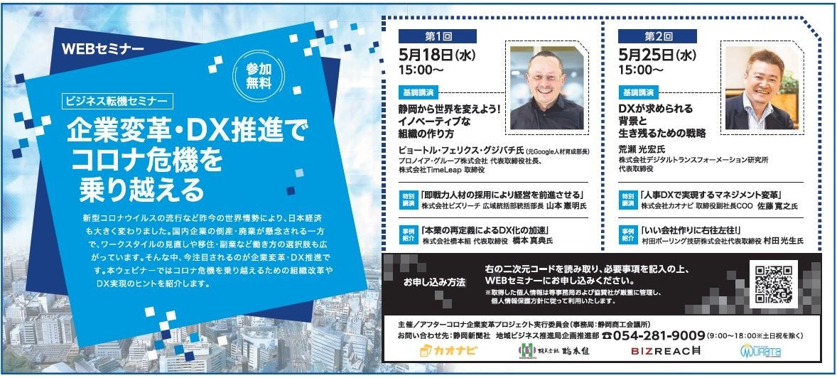 静岡新聞社と静岡商工会議所でつくるアフターコロナ企業変革プロジェクト実行委員会は5月18日(水)、25日(水)に「企業変革でコロナ危機を乗り越える〜 ビジネスの転機セミナー〜」を開催します。