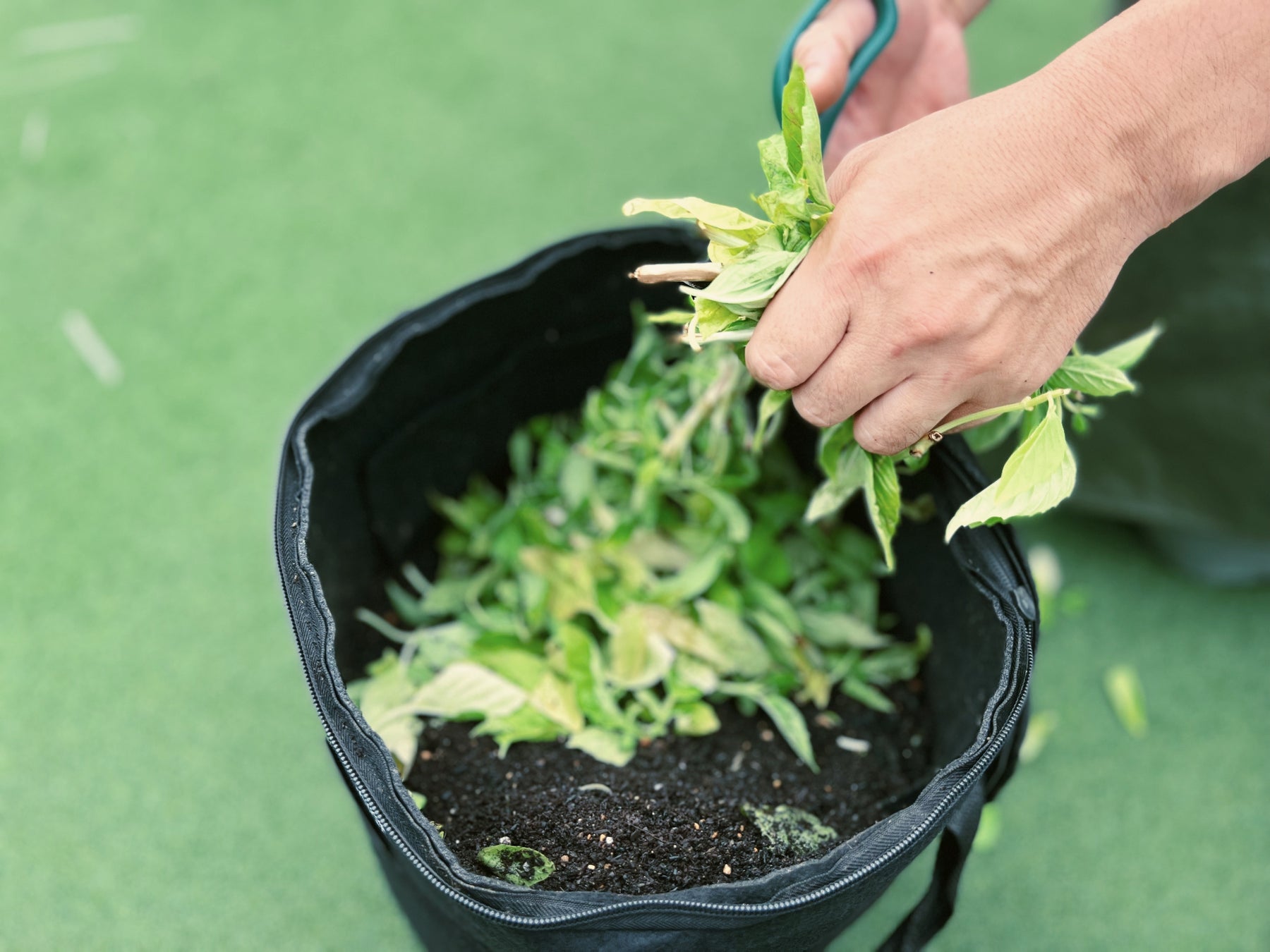 アクアポニックス栽培で栽培したものの出荷規格に合わない規格外のハーブや米ぬかなどを混ぜて堆肥を作るなど土作りからこだわりハーブを栽培しています。通気性・透水性が良く根腐れやサークリング現象を軽減できるルーツポーチを使用し、さらに健康な土で栽培することで土中に細かい根が張りすくすくと元気なハーブが育ちます。