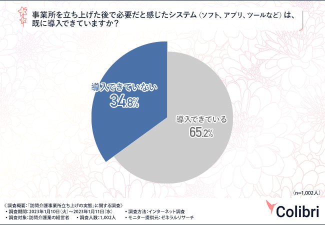 「事業所を立ち上げた後で必要だと感じたシステム(ソフト、アプリ、ツールなど)は、既に導入できていますか?」と質問したところ、『導入できている(65.2%)』『導入できていない(34.8%)』と、3割以上が導入できていないようです。