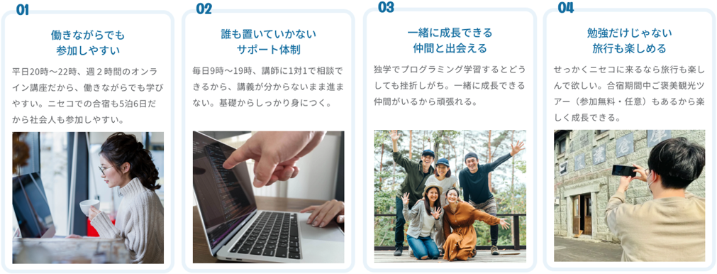 合宿期間中にはオプショナルツアーでニセコ町観光ツアーも用意(任意参加)。単なるスキルアップ合宿ではなく、同じ志を持った仲間との出会いや、リゾート地で過ごす短期集中型の学習を通して、非日常のなかで「新たな成長」を目指せるカリキュラムを用意しています。