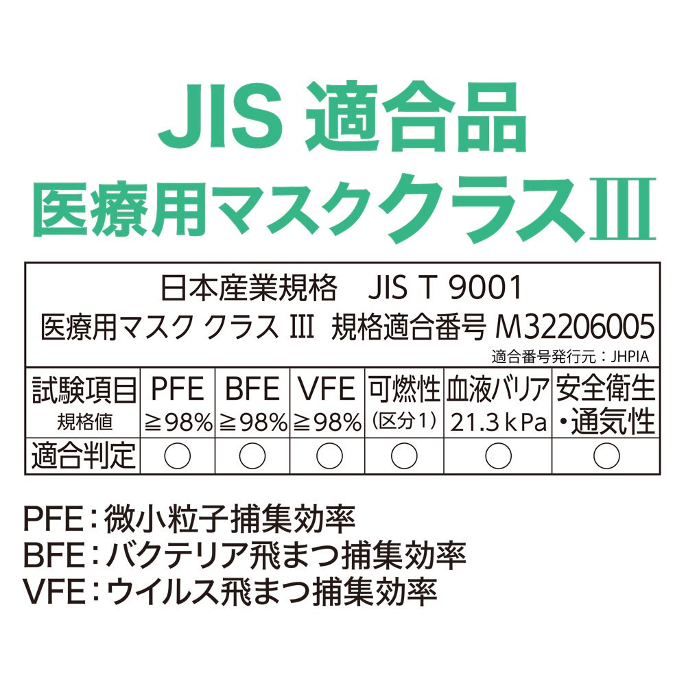 当社のサージカルマスクは、日本産業規格(JIS T 9001医療用マスク)において、クラスⅢに適合しています。