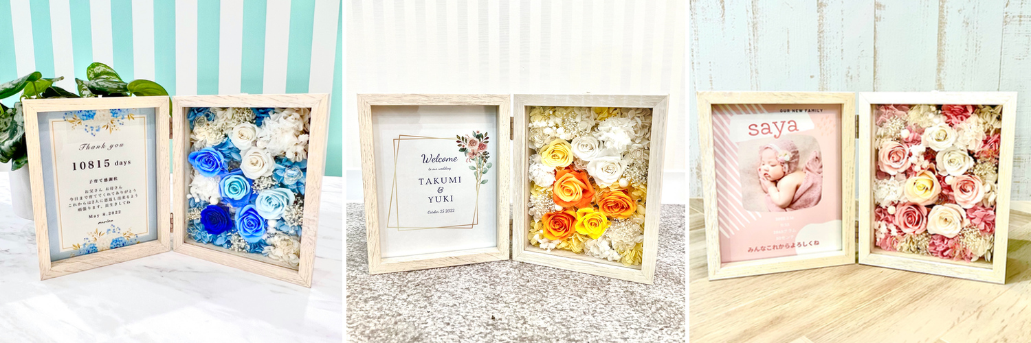 生花と変わらない外観を持ちながら、美しさを長く保つことのできるプリザーブドフラワー。結婚式や誕生日のプレゼントとして人気沸騰中。また、枯れない美しさから玄関やリビング台に飾って楽しむ方も非常に多いです。左には、シーンに合わせてお好きな写真やメッセージを印刷したガラスを入れた唯一無二のサプライズボックスです。