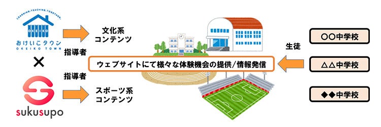 今後、佐賀県内において、部活動の地域移行支援を目的に、両社は多様なスポーツ・文化活動の機会を子どもたちへ提供します。具体的には、地域の講師と生徒のマッチングを促進すべく、「sukuspo」の運動系活動に関するノウハウ及び「おけいこタウン」の文化系活動を融合したウェブサイトを運営し、有益な情報を提供します。