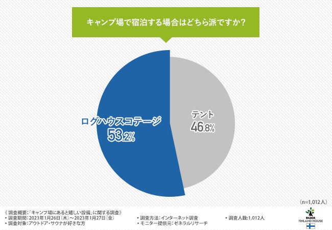 「キャンプ場で宿泊する場合はどちら派ですか?」と質問したところ、『テント(46.8%)』『ログハウスコテージ(53.2%)』という回答結果になりました。