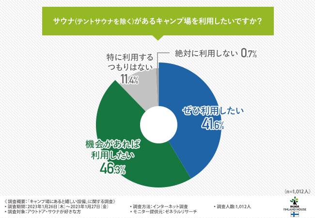 「サウナ(テントサウナを除く)があるキャンプ場を利用したいですか?」と質問したところ、8割以上の方が『ぜひ利用したい(41.6%)』『機会があれば利用したい(46.3%)』と回答しました。