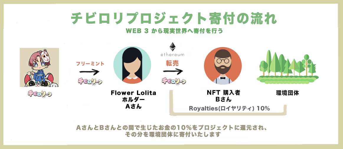 今回発売されたNFT「チビロリータ」は購入者に無料で配布され、同NFTが二次流通する際に生じる運営側への収益が、購入者達の合議で決められた自然保護団体に全額寄付される取り組みとなっております。