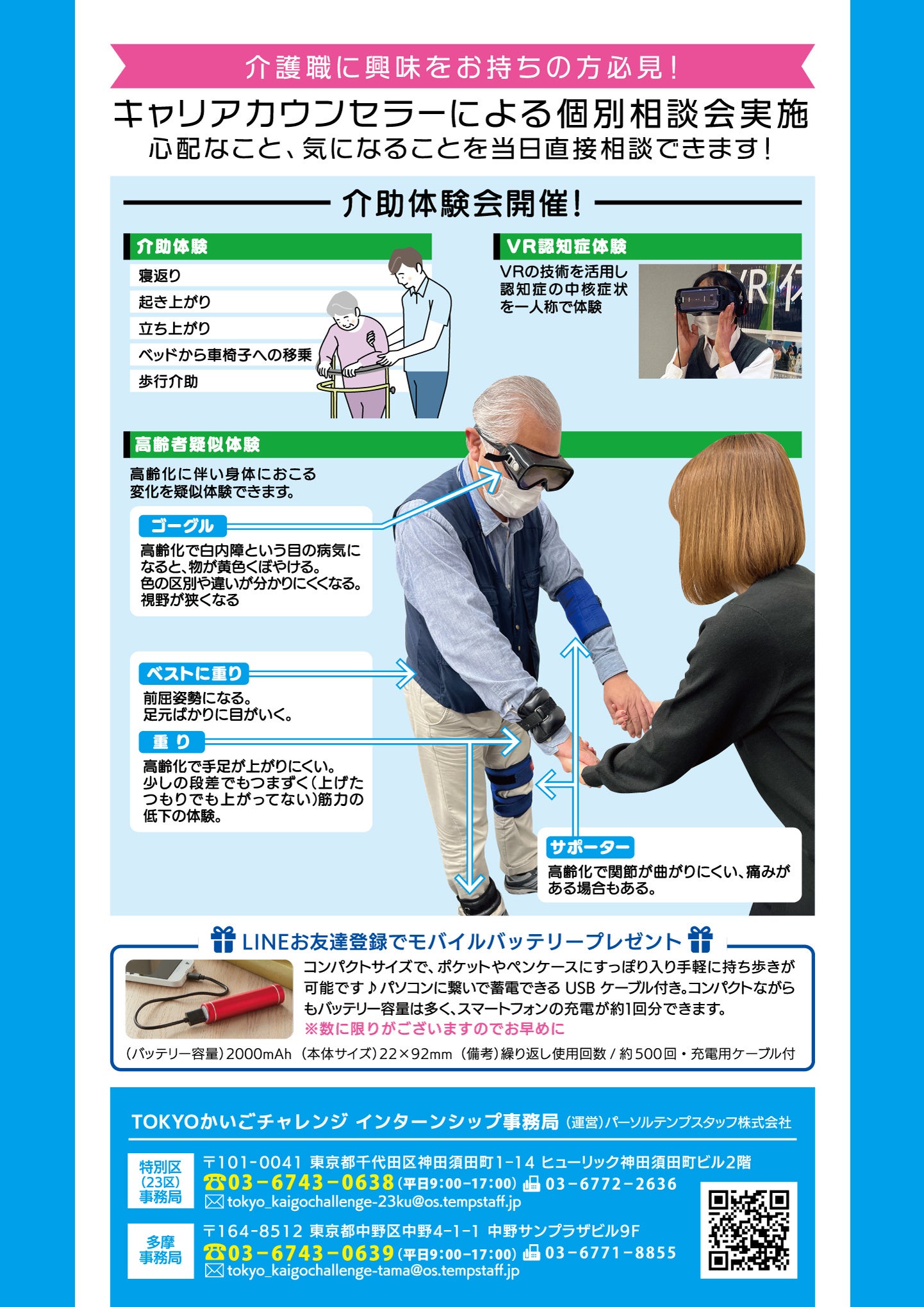 このほかにも、会場ではVRの技術を活用した「認知症の中核症状」の疑似体験、重りのついたベストやサポーターを身に着ける「高齢者の運動機能」の疑似体験などのコーナーを設けています。また「TOKYOかいごチャレンジインターンシップ」についての事業説明や、ご希望の方にはキャリアカウンセラーによる個別相談会もおこないます。